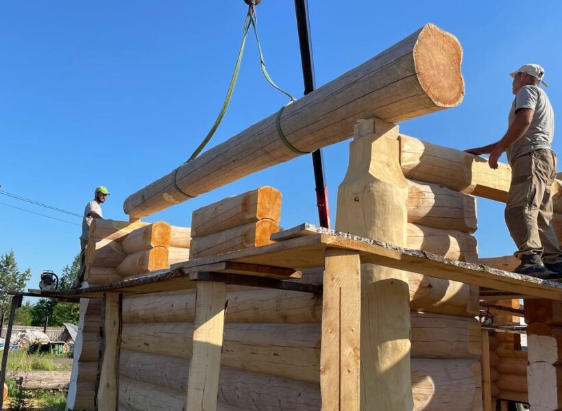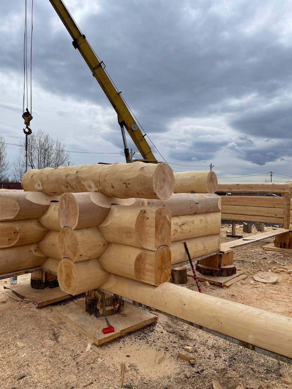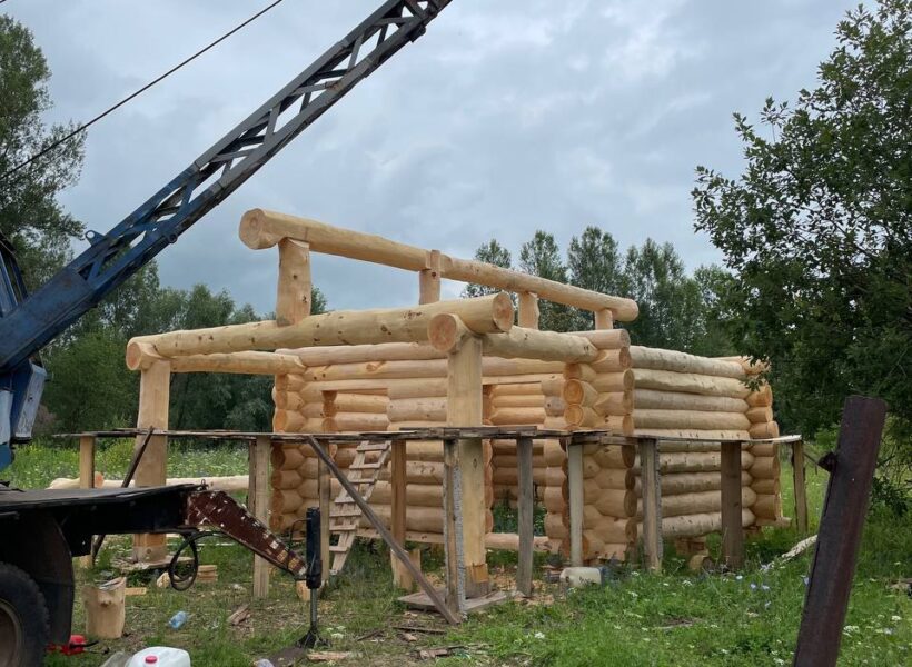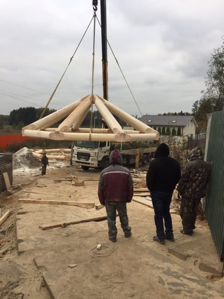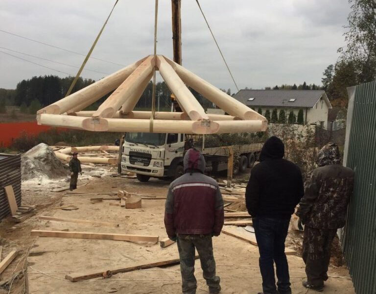 Бригада из 3-5 человек установит сруб на фундамент с помощью автокрана. Мы можем предоставить свой автокран, если расстояние позволяет, либо арендовать его на месте. Проживание бригады организует заказчик – рядом со строительной площадкой. Также заказчик берёт на себя расходы на проезд бригады к месту строительства и обратно. Дополнительные работы, помимо установки сруба, оговариваются заранее и фиксируются в договоре, с указанием перечня работ и сроков их выполнения. После установки сруба необходимо незамедлительно возвести кровлю, чтобы защитить конструкцию от осадков и солнца. Это может быть как временная, так и капитальная кровля.