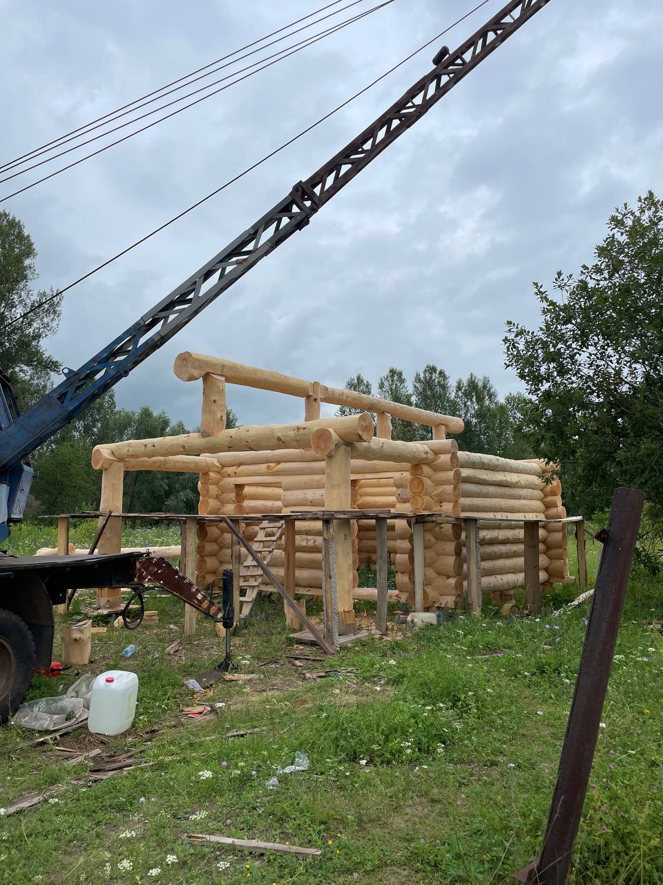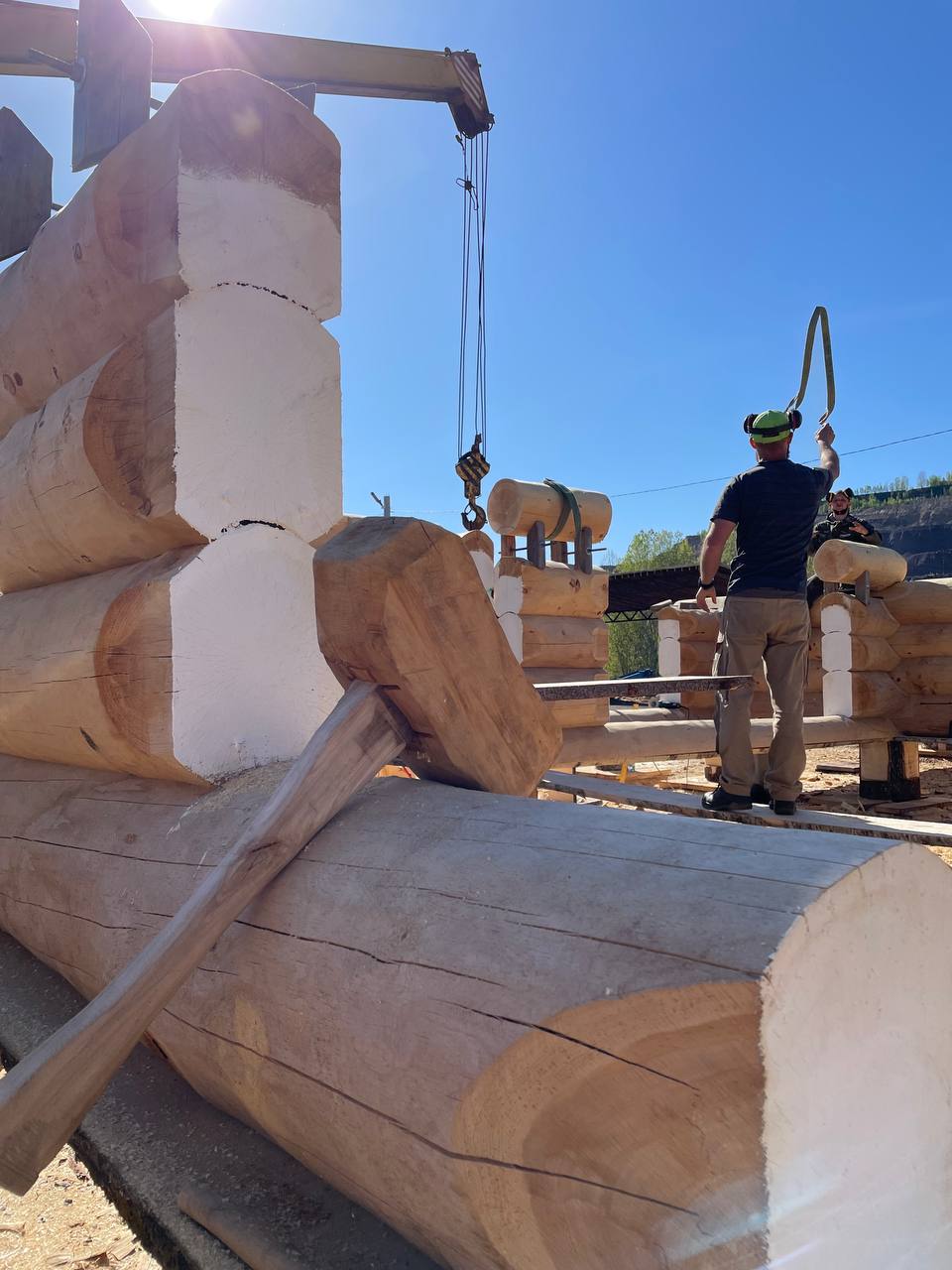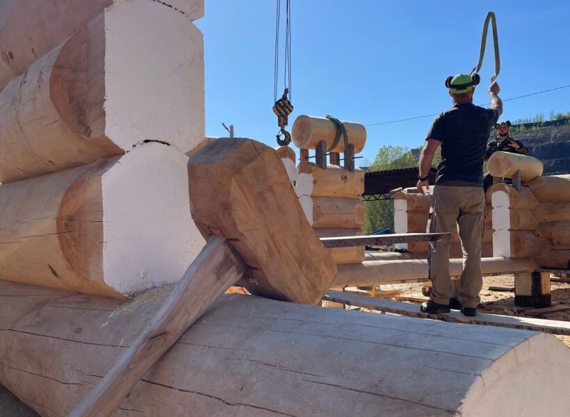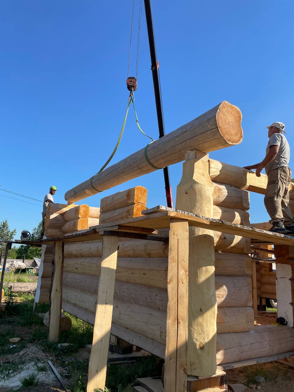 Бригада из 3-5 человек установит сруб на фундамент с помощью автокрана. Мы можем предоставить свой автокран, если расстояние позволяет, либо арендовать его на месте. Проживание бригады организует заказчик – рядом со строительной площадкой. Также заказчик берёт на себя расходы на проезд бригады к месту строительства и обратно. Дополнительные работы, помимо установки сруба, оговариваются заранее и фиксируются в договоре, с указанием перечня работ и сроков их выполнения. После установки сруба необходимо незамедлительно возвести кровлю, чтобы защитить конструкцию от осадков и солнца. Это может быть как временная, так и капитальная кровля.